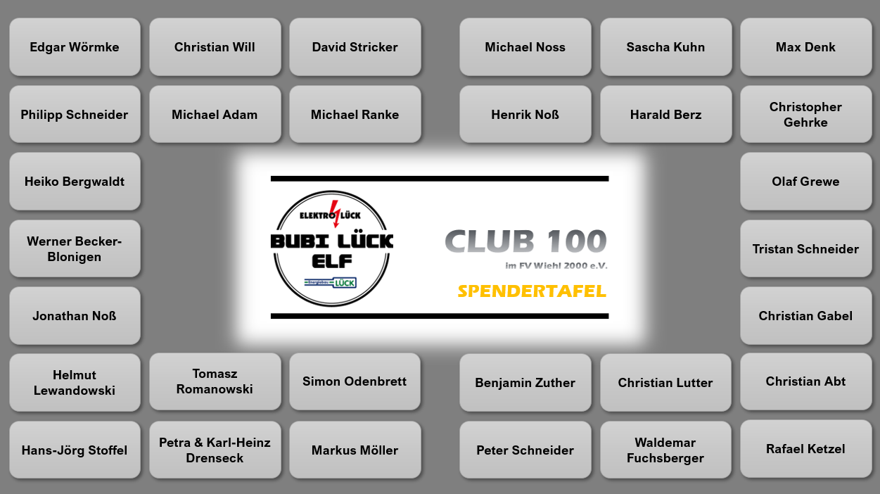 Mit dem „Bubi Lück Elf Club 100“ möchten wir einen Förderkreis etablieren, der den FV Wiehl nachhaltig unterstützt, die in den vergangenen Jahren aufgebaute Struktur sichert und zukunftssicher ausbaut. Eine Unterstützung ist ehrenamtlich und finanziell möglich.