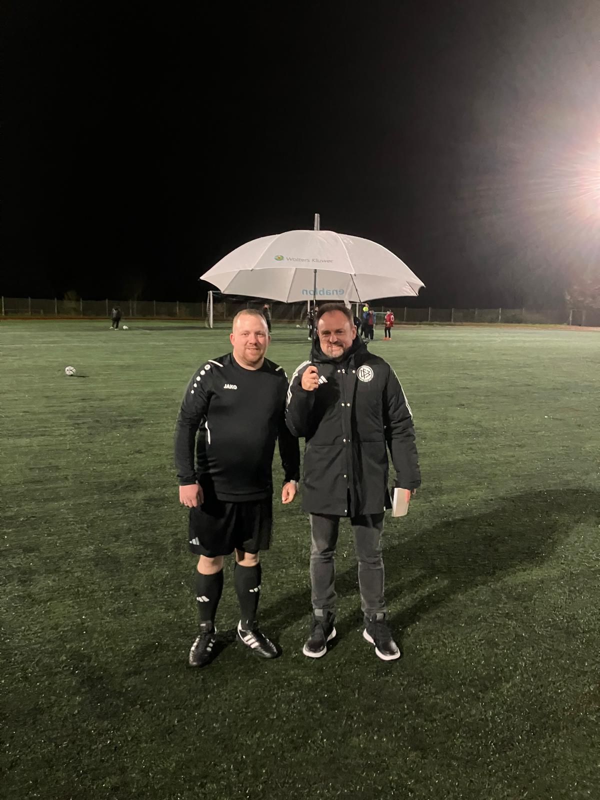Es herrscht Dauerregen, besondere Vorkommnisse gibt es in der ersten Halbzeit keine. In der Pause erhält Krämer, der für den FV Wiehl pfeift, ein Feedback von seinem Paten - mit Verbesserungstipps, aber auch einem großen Lob. „Thomas kann noch etwas lauter pfeifen und die Pfiffe variieren”, so Assmuth. „Aber insgesamt merkt man kaum an, dass es erst das vierte Spiel ist. So wie er pfeift, wirkt das, als hätte er schon ein paar Jahre Erfahrung.”