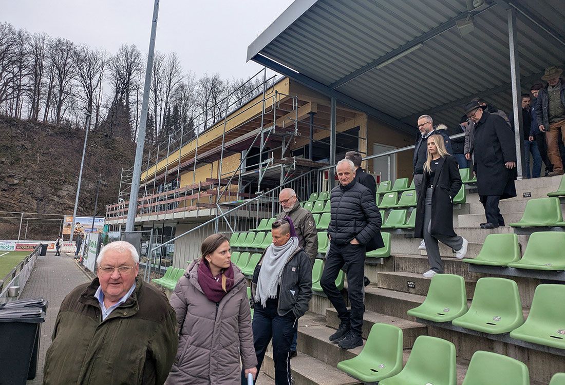 Zwei Stockwerke haben die beiden Gebäude. Burgmer führte die Ausschussmitglieder unter anderem zusammen mit Christian Denk von der Stadt und den Vereinsvertretern um FV-Chef Christian Will durch den künftigen Bewirtungs- und Kassenbereich bei Heimspielen oder auch die weiteren Vereinsräume, die durch den Neubau geschaffen werden.